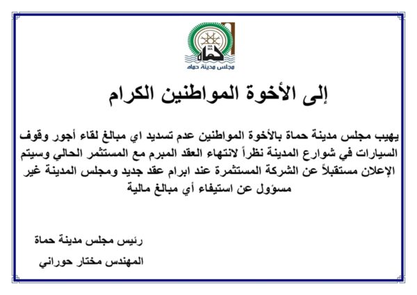 وجاء في بيان نشره مجلس المدينة عبر موقعهم على الانترنت : ” يهيب مجلس مدينة حماة بالأخوة المواطنين عدم تسديد أي مبالغ لقاء أجور وقوف السيارات في شوارع المدينة نظرا لانتهاء العقد المبرم مع المستثمر الحالي وسيتم الإعلان عن الشركة الجديدة المستثمرة عند توقيع عقد جديد وأن المجلس غير مسؤول عن أي مبلغ يتم دفعه”.