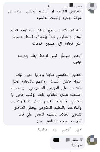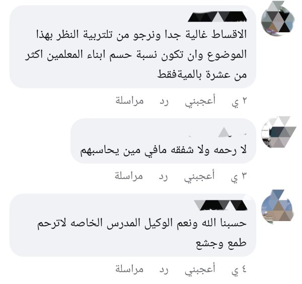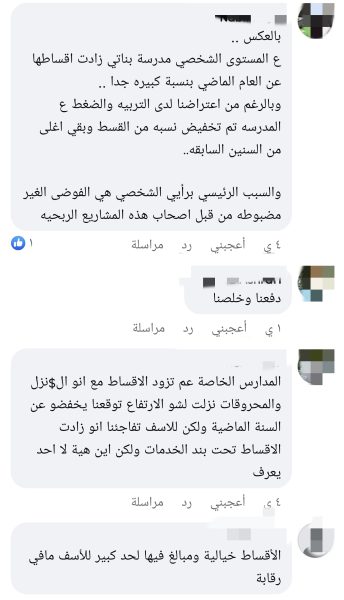 وطالبت معظم التعليقات بضرورة تدخل عاجل وضروري لوضع حد لهذه الأسعار مع فتح باب التسجيل للعام القادم في جميع المدارس الخاصة التي تحولت من مدارس تعليمية إلى شركات ربحية بدون رقابة.